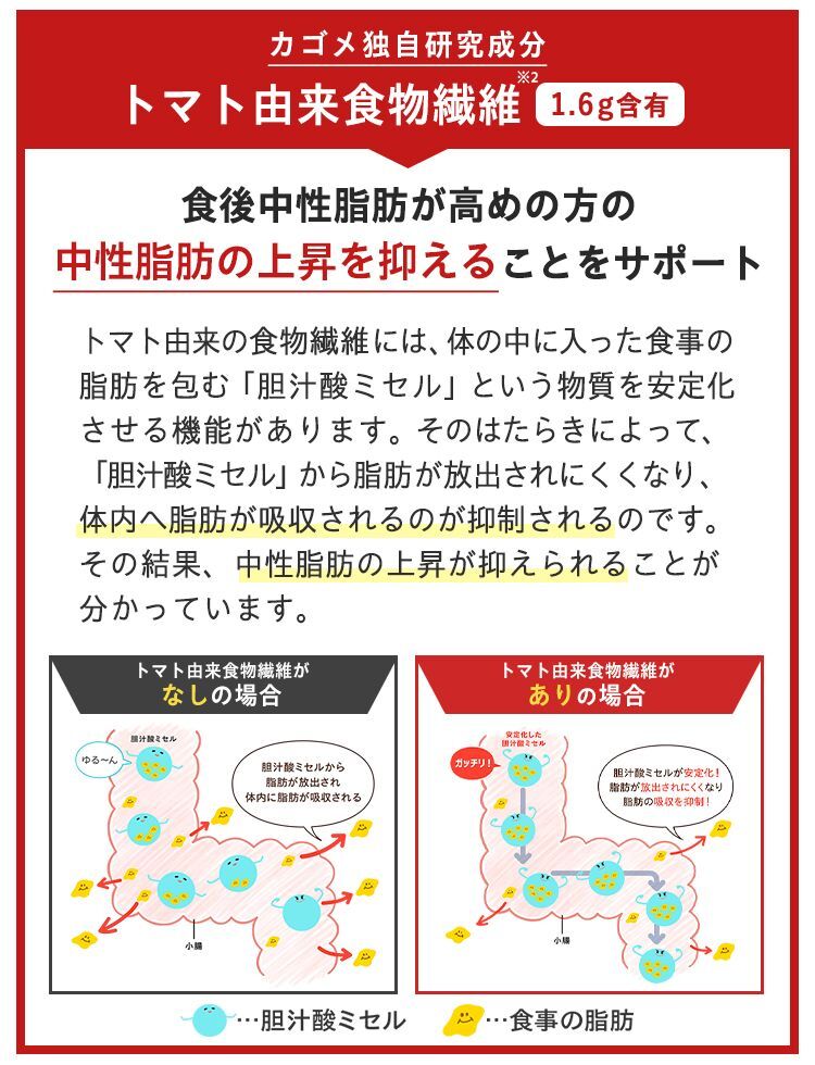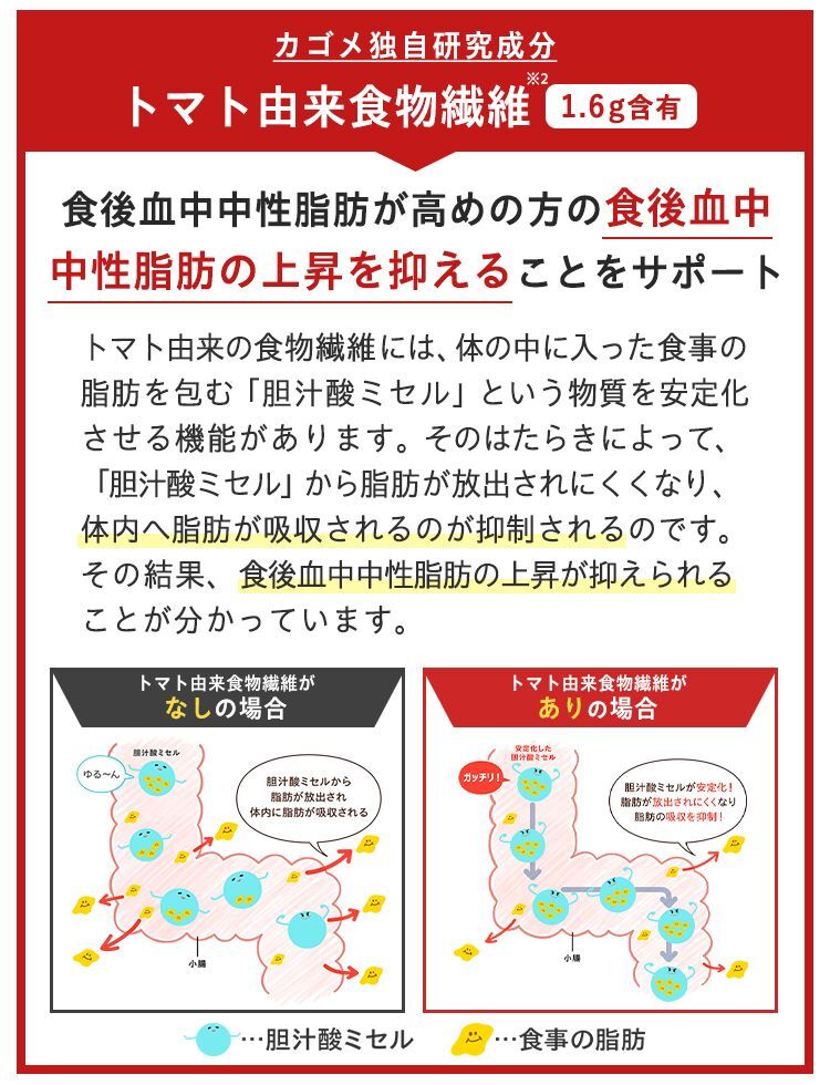 【届出表示】本品にはトマト由来食物繊維が含まれます。トマト由来食物繊維には、食後の血中中性脂肪が高めの方の食後血中中性脂肪の上昇を抑える機能が報告されています。