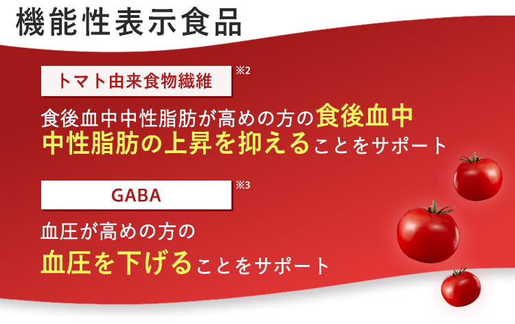 【届出表示】本品にはトマト由来食物繊維とGABAが含まれます。トマト由来食物繊維には、食後の血中中性脂肪が高めの方の食後血中中性脂肪の上昇を抑える機能が報告されています。GABAには血圧が高めの方の血圧を下げる機能が報告されています。
